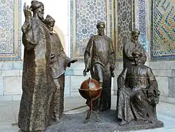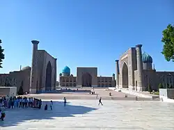 Timurid architecture started with the sanctuary of Ahmed Yasawi in present-day Kazakhstan and culminated in Timur's mausoleum Gur-e Amir in Samarkand. Timur's Gur-I Amir, the 14th-century mausoleum of the conqueror is covered with "turquoise Persian tiles".[27] Nearby, in the center of the ancient town, a "Persian style madrassa" (religious school)[27] and a "Persian style mosque"[27] by Timurid Sultan Ulugh Beg is observed. The mausoleums of Timurid princes, with their turquoise and blue-tiled domes, remain among the most refined and exquisite Persian architecture.[28]