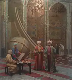 The reign of Sultan Ulugh Begh saw the scientific peak of the empire. During his rule, al-Kashi produced sine tables to four sexagesimal digits (equivalent to eight decimal places) of accuracy for each degree and includes differences for each minute. He also produced tables dealing with transformations between coordinate systems on the celestial sphere, such as the transformation from the ecliptic coordinate system to the equatorial coordinate system.[31] The Sullam al-Sama was authored, which provided the resolution of difficulties met by predecessors in the determination of distances and sizes of heavenly bodies such as the Earth, the Moon, the Sun and the Stars. The Treatise on Astronomical Observational Instruments was also written which described a variety of different instruments, including the triquetrum and armillary sphere, the equinoctial armillary and solsticial armillary of Mo'ayyeduddin Urdi, the sine and versine instrument of Urdi, the sextant of al-Khujandi, the Fakhri sextant at the Samarqand observatory, a double quadrant Azimuth-altitude instrument he invented, and a small armillary sphere incorporating an alhidade which he invented.[32]