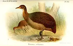 All tinamou are from the family Tinamidae, and in the larger scheme are also ratites. Unlike other ratites, tinamous can fly, although in general, they are not strong fliers. All ratites evolved from prehistoric flying birds, and tinamous are the closest living relative of these birds.[4] Formerly, this bird was divided into two subspecies: T. s. pernambucensis in north-east Brazil (Pernambuco and Alagoas), and T. s. solitarius found in south-east Paraguay and extreme north-east Argentina. The former, however, turned out to be not distinct from the nominate but rather individual birds that showed a particular color morph which is now known to also occur elsewhere.[5] Notably, the hue of the back varies between olive and rusty, and the intensity of the lower neck's plumage color also varies. The black barring in these areas is more or less strong. pernambucensis refers to yellower birds with much barring, especially on the neck.[6]