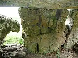The structure is a dolmen,[1] which was the most common megalithic structure in Europe. The dolmen is of the Severn-Cotswold tomb type,[3][4] and consists of a large capstone on top, with smaller upright stones supporting it. The limestone capstone at Tinkinswood weighs approximately 40 long tons and measures 24 feet (7.3 m) x 14 ft (4.3 m);[3] it is thought to be the largest in Britain, and also in Europe.[5][6] It would have taken some 200 people to lift the stone into the correct position.[3] It was originally all covered by a mound of soil, which has been removed over time. The remaining mound behind the structure measures approximately 130 ft (40 m) x 59 ft (18 m) in size.[3]