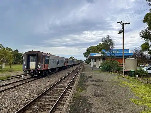 ![]() A train stopped opposite the Tintinara railway station building, June 2023 | |||||||||||