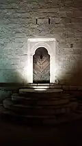 The entrance to the tower, located on the southern side, is reached via a short flight of steps. The gate is topped by a semicircular arch of carved stone and framed on three sides by a stepped border made of stones with curved profiles. The entrance features six elegantly crafted stones, which contribute to its aesthetic appeal. Inside, a metal ladder leads to the upper levels.