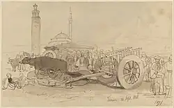 The earliest visual documentation of the clock tower appears in two watercolor paintings by English artist Edward Lear on September 28, 1848. Albanologist Georg von Hahn described the tower as having Rococo stylistic influences—although not entirely accurate, this description captures the decorative nature of its structure. European authors such as Ami Boué and Hyacinthe Hecquard have also mentioned the clock tower in their 19th-century works and researcher Gabriel Louis-Jaray compared it to the belfries of old French cities.