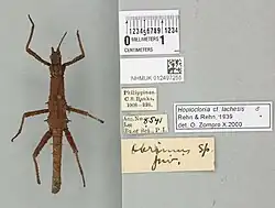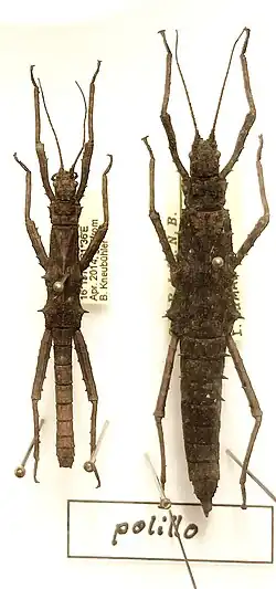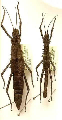 - ^ Zompro, O. (2004). Revision of the genera of the Areolatae, including the status of Timema and Agathemera (Insecta, Phasmatodea), Goecke & Evers, Keltern-Weiler, pp. 206–207, ISBN 978-3-931374-39-6