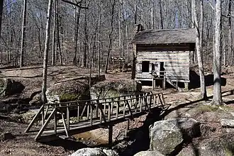 The park was among those constructed in Mississippi by the Civilian Conservation Corps in the 1930s. CCC Company 3497 began work creating the park in April 1935; the park opened to the public in May 1939.[2] Many of the original facilities are extant, including several buildings, trails, picnic tables, campgrounds, cabins and a fishing pond used by the CCC workers themselves. The rustic quality of the CCC structures resulted from the use of native materials, their original designs, and the craftsmanship of the builders. While most of the facilities in Mississippi were built of wood, Tishomingo and Wall Doxey state parks feature substantial use of stone construction.[11]