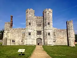 Unlike his similar project at Beaulieu Abbey, which he had also been granted by King Henry, Wriothesley chose to convert the main abbey buildings, including the church, into his house. It was an imaginative scheme, built under the direction of master mason Thomas Bartewe, a prominent contractor for King Henry's contemporary fortification works along the South Coast.[15] He constructed a spectacular castellated gatehouse with four octagonal turrets which was forced through the middle of the nave to provide the appropriate seigneurial emphasis needed for a classic Tudor courtyard house.[17] The cloister became the central courtyard of the house (a magnificent fountain was placed in the middle), the old refectory, with the addition of a grand porch, became the great hall, while the rest of the abbey was turned into fine apartments for the family. The church tower was initially kept as part of the house but it was soon demolished on the advice of John Crayford, one of the king's commissioners who helped to oversee the reconstruction on behalf of Wriothesley. Crayford was anxious to see the tower pulled down as, if it was left standing, the chimneys would have to be raised some twenty feet higher - and at great cost - to avoid defacing the church tower with their smoke.[16] Other features of the mansion included a private indoor theatre and a deer park.[6][18]