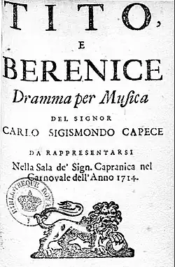 According to a French correspondent at the time, Ottoboni "interfered" considerably in the writing process of the libretto for Tito and Berenice, making numerous modifications. Although only Capece's name appears on the printed libretto published by Bernabò for the 1714 premiere, some sources credit Ottoboni as a co-author.[4] The libretto borrowed and mixed plot elements from two earlier French plays, Corneille's Tite et Bérénice and Racine's Bérénice, both of which were inspired by Suetonius's brief account in De vita Caesarum of the love affair between the Jewish queen Berenice of Cilicia and the future Roman Emperor Titus.[5] All the principal characters were real historical figures, but considerable liberties were taken with the historical facts, most notably the entirely fictitious marriage of Berenice to Antiochus, King of Commagene at the end of the opera.[6] The opera premiered on 10 January 1714 at the Teatro Capranica with three ballet intermezzi: Mori e schiavi, Giardinieri, and Popolo festante.[7] The elaborate scenography by Juvarra involved 10 changes of sets and a stage machine.[8] The roles of the lovers Berenice and Tito (Titus) were sung by two virtuoso castrati, Benedetto Baldassari and Domenico Tempesti.
