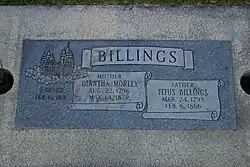 Titus Billings (March 25, 1793 – February 6, 1866) was an early convert to the Latter Day Saint movement.[1] He served in several positions in the church and was a contemporary of Joseph Smith and Brigham Young. Billings was a counselor in the first Bishopric of the Church to Edward Partridge. He participated in the Battle of Crooked River and was a colonel in the Nauvoo Legion. He participated in the Mormon migration as a Captain of Fifty in the second company and was a notable settler of Manti, Utah.