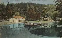 The current pond was dug in 1880 on the order of the Ljubljana City Council as a fire-fighting water reservoir for a fire brigade from the neighbourhood of Rožna Dolina.[6] Three years later, it was expanded at its southern side, and covered an area of around 8,500 square kilometres (3,300 sq mi).[26] It was populated with goldfish and other ornamental fish, and European tree frogs heard quite far towards the Ljubljana downtown, at least to Župančič Street (Župančičeva ulica).[24][27] It was used for boating and ice skating.[20] At first,[24] the pond was managed by the Laibacher Eislaufverein skating club, which built pavilions for skaters and spectators at a certain distance and a covered[24] changing area[28] all of them constructed in a Vienna Secession style.[10] It also arranged the surroundings, among other things it planted seven trees at the upper part of the pond, as evident from postcards and photos from around 1900.[24]