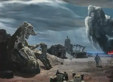 To the Future belongs to Willink's last phase as a painter which began in the 1960s. It is one of 19 paintings from this period that depict a confrontation between modern civilization and the ancient world, and where modern science and warfare are portrayed in apocalyptic scenarios. A source of inspiration was Oswald Spengler's book The Decline of the West, which Willink read as a student and from which he adapted the theme of a dying Western culture and a view of progress as a bringer of decline.[2] Willink's fascination with the Garden of Bomarzo began when he saw pictures of it in the book Die Welt als Labyrinth (1957) by Gustav René Hocke.[3] He visited and photographed the park in 1960 and 1962, and sculptures from it appear in several of his paintings from the mid-1960s and onwards, usually under threatening skies and together with alienating elements.[1]
