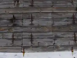 The interior framing would be set up in bents up ten feet,[3] but more often about four feet apart horizontally,[2] so that laths (also called "tobacco sticks") with tobacco attached to them could be hung for drying.[3] The tier poles were often supported by posts and cross beams, the space in between known as the "bents." The bents ranged in vertical spacing from 20 inches to five feet wide. The bent itself became an important earmarker in determining crop volume. Farmers would commonly refer to barn size in terms of bents and the rule of thumb was one bent will hang half an acre of tobacco.[2] In some areas, bents were called "rooms," even though this just defined a narrow and tall division of the inside of the barn by the tier poles. In North Carolina, for instance, bents were called rooms, and a typical barn for curing flue cured tobacco was four rooms in size.