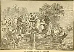 A tobacco bride (or "tobacco wife") is a descriptive name for a young woman that emigrated to Colonial Virginia to marry a settler. Following the settlement of the Jamestown, Virginia colony in the early 1600s there was a vast gender imbalance, as most of those who left for Jamestown were men who were tasked with building and establishing the settlement itself.[1] There were about 100 women with families already in colonial Virginia, but there was still a significant gender divide (7∶1 men to women).[2] Beginning in 1619, young single women from England were offered by Virginia Company of London the opportunity to travel to Jamestown to marry and start families and to increase the population.[1]