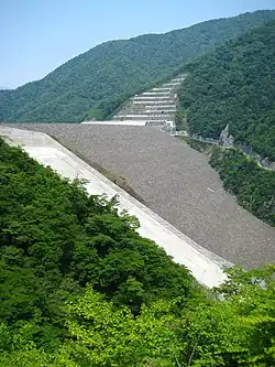The Tokuyama Dam (徳山ダム, Tokuyama damu) is an embankment dam near Ibigawa, Ibi District, Gifu Prefecture in Japan. The dam was completed in 2008 and will support a 153 MW hydroelectric power station that is expected to be fully operational in 2015. Unit 1 at 23 MW was commissioned in May 2014. The dam was originally intended to withhold the upper reservoir of a 400 MW pumped-storage power station until a design change in 2004. The dam is also intended for flood control and water supply. It is the largest dam by structural volume in Japan and withholds the country's largest reservoir by volume as well.[1]