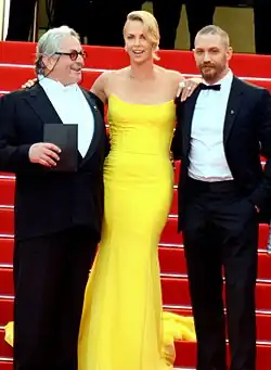 Hardy (right) with George Miller and Charlize Theron at the 2015 Cannes Film Festival