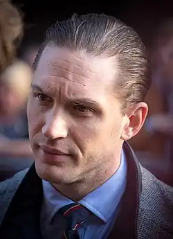 In 2013 Hardy starred in the drama film Locke.[44] In 2014 he appeared in the crime film The Drop alongside James Gandolfini, in what would be Gandolfini's final appearance in a feature film before his death. Hardy also joined the cast of the BBC crime drama Peaky Blinders in its second series. He portrays Alfie Solomons (who is based on a real-life East End Jewish gangster named Alfred Solomon), the head of a Jewish gang based in Camden Town, and the runner of a distillery which disguises itself as a bakery.[45] Writing for Medium, Shani Silver described Hardy's portrayal of Alfie Solomons as 'The Scene-Stealingest Character Of All Time', commenting that "I’ve never understood if Alfie was meant to be a villain or comedic foil or some pick-a-mix of both, but I’ve never loved every second of someone’s screen time more."[46]