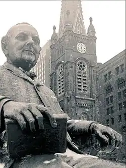 Statue of Tom Johnson holding Henry George's Progress and Poverty