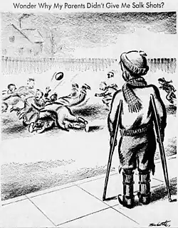 Prompted by his mother's illness, he returned to the Tennessean.[2] He became city editor in 1931, but following a dispute with the publisher he left that post in 1937.[2][3] He began drawing editorial cartoons for the Tennessean in 1934 and drew exclusively after abandoning editing and reporting in 1937. He had been tutored by fellow Pulitzer winner Carey Orr before Orr left for the Chicago Tribune in 1917, but a stronger influence was the work of another winner, Dan Fitzpatrick of the St. Louis Post-Dispatch. His drawing style resembled Fitzpatrick's and the work of both men was noted for biting content.[2] For his part, Fitzpatrick disliked the resemblance and considered Little an "imitator".[5] Little became one of the most influential and republished cartoonists in the US.[2] His Pulitzer-winner cartoon featured a young boy with crutches and leg braces watching other boys play football, and is captioned "Wonder why my parents didn't give me Salk shots?"[1][2]