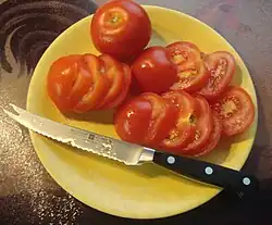 A tomato knife is a small serrated kitchen knife designed to slice through tomatoes. The serrated edge allows the knife to penetrate the tomatoes’ skin quickly and with a minimum of pressure without crushing the flesh. Many tomato knives have forked tips that allow the user to lift and move the tomato slices after they have been cut.[1][2]