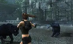 Prior to release, Crystal Dynamics and Eidos were approached by Microsoft to create exclusive DLC for the Xbox 360, with Lindstom describing the content as being entirely new rather than material held back from the main game.[77] According to a later statement, Lindstrom said that some features were cut from the main game due to time constraints and were incorporated into the DLC, which he was pleased about.[22] The design goal for "Beneath the Ashes" was to expand upon the gameplay concepts of the main game in a new environment, while "Lara's Shadow" gave the team an opportunity to create new gameplay mechanics for the Doppleganger. While the narratives built on established plot points, they were intended as standalone experiences that would not fit into the main campaign.[78] For the DLC, Eidos collaborated with fashion designers in Quebec to create outfits for Lara, one of them voted on by fans.[79] Originally planned for release on 24 February 2009, the first episode "Beneath the Ashes" was delayed due to an unspecified technical issue.[80] "Beneath the Ashes" was released on 24 February, while "Lara's Shadow" was released on 10 March.[81]