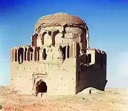 The Tomb of Ahmad Sanjar is a mausoleum commemorating Ahmad Sanjar, a Seljuk ruler of Khorasan. It was built in 1157 in the medieval city of Merv in the Karakum Desert in Turkmenistan.[1] Throughout his reign, Sanjar fought off several invasions and uprisings until finally being defeated by the Oghuz.[2] After being sacked by the Oghuz, Merv declined and in 1221, the Mongols attacked it and burned down the mausoleum.[3] It would later be restored by Soviet, Turkmen, and Turkish architects during the 20th and 21st centuries. The tomb is part of The State Historical and Cultural Park "Ancient Merv", a UNESCO World Heritage Site.[4]