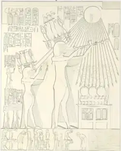 Akhenaten and Nefertiti are shown side by side on a raised platform before an altar. Nefertiti is shown to the left of Akhenaten and is only indicated by an outline. They seem to be pouring something onto the altar. Meritaten is shown offering loaves, while Meketaten and Ankhesenpaaten shake a sitrum. The princesses are accompanied by two nurses and three attendants.[1]