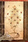 On the Western wall of the tomb, there are twelve people in the orchestra. In the front row there are five women (from right to left) playing the konghou (箜篌; bow harp), the guzheng (古箏; an 18–23-stringed plucked zither with moveable bridges), pipa (琵琶; lute), paiban (拍板; bamboo clapper) and dagu (大鼓; bass drum) while, in the back row, there are seven women playing the sheng (笙; mouth organ), fang xiang (方響; Chinese metallophone), dalagu (答臘鼓;[3] West Asian cylindrical drum),[4] two bili (篳篥; oboes), and two bamboo transverse flutes (hengdi 橫笛 or dizi 笛子).[5] At the far right of the front row is a female conductor dressed like a man with two children dancers in front of her.[5]