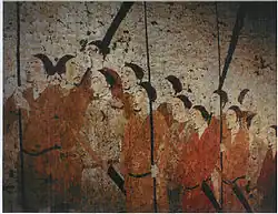 Murals cover more than 300 square meters of the tomb.[5] To prepare the walls for the paintings, they were first coated with white plaster on which the artist outlined the design and filled it in with color.[1] The murals begin immediately upon entering the passageway. Going down, towards the coffin chamber, both walls alongside the path are covered with paintings. They begin with images that are now damaged but were probably mythical birds followed by an honor guard, and then, closest to the chamber, are groups of men leading riderless horses. On either side of the entranceway, doormen stand solemnly holding whips. All four walls and ceiling of the tomb chamber are painted. The north wall, directly opposite the entrance, shows the deceased and his wife on a canopied funerary couch,[6] presiding over a feast and surrounded by musicians playing Central Asian instruments.[7] On the western wall, the mural depicts a tacked-up riderless horse under a canopy, preceded by an honor guard. The focus of the eastern wall is an oxen-pulled chariot under a canopy. Like the western wall, an honor guard also precedes the chariot.[8] The south wall shows the honor guard. The clothes of the people in the murals are typical of the Xianbei people of that time.[9]