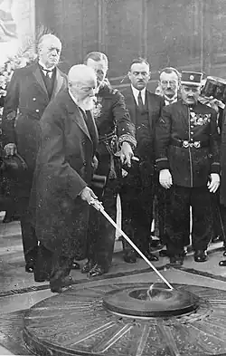The sacred flame under the triumphal arch was lit for the first time at 6 p.m. on 11 November 1923 by André Maginot, who was then the Minister of War.[21][22]