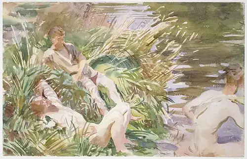 The work depicts soldiers bathing, resting, and sleeping or napping, implying a narrative from the bathing soldier, to the soldier drying himself in the sunlight, to the partially dressed soldier.[3] Sargent used a high, voyeuristic viewpoint and shows the men in a state of complete relaxation. He also captured the shadows cast across the bodies by blades of grass, with technical facility.[4]