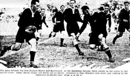 Chase was named in the New Zealand Māori side to play Queensland on July 20 at first five eighth in place of G Ngaia after he was said to have “completely recovered”.[220][221] The Māori side won 15-13 at the Brisbane Exhibition Ground before a crowd of 10,000. In the first half “Chase was held up as he looked to be through”. He almost scored when “his pace almost beat Hayes for the ball behind the line”. Near the end of the match “Chase was through brilliantly, but cutting out Hemi he threw a long pass to Smith. The winger could not field it and Ward saved” for Queensland.[222][223] The Māori side did not get much ball overall and as a result Reedy, Chase and Hemi were “not seen at their best”.[224] In comments on the game it was said that “Chase was inclined to kick too often, but the little five eighth soon realised the futility of those tactics unless pressure demanded it and let the ball out smartly”… and that “Chase and Reedy were a safe handling and hard running pair of five eighths”.[225] Chase and Harrison “gave Bennett and Lewis little room in which to” attack.[226] The difference that Phillips, Chase, J Reddy, Mataira, and Brodrick “made to the team was apparent throughout. It was at least a 25 per cent better side”. Phillips, Hemi, Smith, and Chase “were all responsible for outstanding play” in the backline.[227]