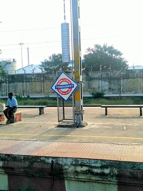 Tondiarpet railway station is one of the railway station of the Chennai Central–Gummidipoondi section of the Chennai Suburban Railway Network. It serves the neighbourhood of Tondiarpet, a suburb of Chennai, and is located 5 km north of Chennai Central railway station. It has an elevation of 5 m above sea level.