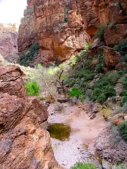 The Tonto National Forest, encompassing 2,873,200 acres (1,162,700 ha; 11,627 km2), is the largest of the six national forests in Arizona and is the ninth largest national forest in the United States.[1][2] The forest has diverse scenery, with elevations ranging from 1,400 feet (427 m) in the Sonoran Desert to 7,400 feet (2,256 m) in the ponderosa pine forests of the Mogollon Rim (pronounced MOH-gee-on, or MUH-gee-own). The Tonto National Forest is also one of the most visited "urban" forests in the United States.[3]