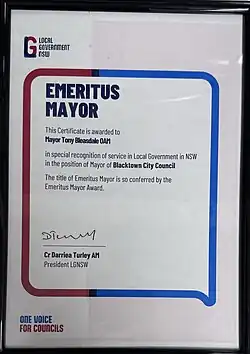 In October 2024, the association of local government New South Wales bestowed upon Anthony John Bleasdale the title of emeritus Mayor.