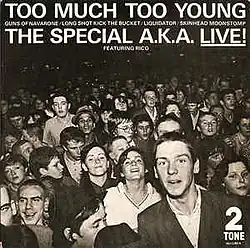 Too Much Too Young - The Special A.K.A. Live! is a live EP by the Specials with Rico Rodriguez, released on 11 January 1980.[1] On the original release, the front cover credited the performers as The Special A.K.A. featuring Rico, while the back cover mentions and the labels credited only The Specials.