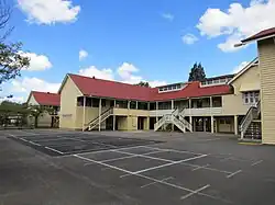 The two Sectional School buildings at Toowong were constructed at the western end of the school complex, connected by verandahs to the 1880 Ferguson building to form a U-shaped courtyard. Due to the slope of the school grounds at that time, the buildings were lowset along the courtyard side, accessed by short flights of steps. Both contained three classrooms with a verandah along the courtyard side, however, the proportions were slightly different, with the 1927 building (north) being longer and narrower than the 1924 building (south). The 1924 building had an attached teachers' room and an additional verandah along its eastern side, and both buildings had hat room enclosures on their verandahs. Windows were banks of casements with fanlights.[37][1]