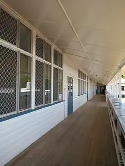 Windows and fanlights to the north verandah have been replaced with sliding aluminium windows, however the openings and timber mullions remain. All classrooms are accessed by timber double doors, most with modern hardware, however those accessing the 1956 classrooms are half-glazed board doors with no fanlight and one retains early hardware. The north verandah has a timber floor, bag rack balustrades and a raked ceiling lined with flat sheeting with cover strips. Original glazed screens survive at the far eastern corner. Three sets of stairs provide access - two sets attached to and running parallel with the verandah, and one set added at the eastern end which comes up through the verandah floor, surrounded by a timber rail balustrade.[1]