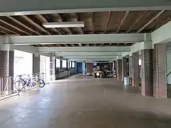 The understorey of the classroom wing has a concrete floor and low, off-form concrete retaining walls surround the western end of the space. Timber bracing walls beneath the 1956 classrooms are lined with diagonal timber boards. A store room with chamferboard-clad walls and timber board doors is located in the southwest corner.[1]