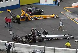 Top Alcohol refers to two different classes in professional drag racing: Top Alcohol Dragster and the Top Alcohol Funny Car. Commonly known as "alky" cars, both are akin in design to the premier Top Fuel classes, but less powerful (about 3,500 bhp (2,600 kW; 3,500 PS)). In both classes, the cars are either supercharged ("blown") engines, burning alcohol (methanol) or can burn nitromethane and be normally aspirated, fuel injected engines.[1] Top Alcohol Dragsters and Funny Cars resemble their nitromethane (Fuel) counterparts, with about half the power of their respective classes. Each car uses a three-speed transmission.[2]
