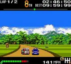 Top Gear Pocket is a racing video game where the player drives rally cars through a series of tracks. As the player wins races, new cars and tracks are unlocked.[2] The game features a total of 14 cars and eight tracks.[3] Races can take place in cities, savannas, grasslands, and snowy trails.[3] Both two-wheeled and four-wheeled cars are featured in the game and the handling of each car varies significantly.[3] The game cartridge features a built-in rumble feature that vibrates when the player crashes into other cars or slides on the track,[2] but does not feature a battery to save the game progress, so passwords must be used to restore the game to a specific state.[3] The game also includes a multiplayer mode where two players can race against each other.[3] The Game Link Cable is required for multiplayer.[4]