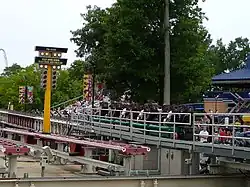 Top Thrill Dragster's media day was held on May 1, 2003,[17] and it officially opened to the public three days later.[18] It became the tallest and fastest roller coaster in the world, surpassing Superman: The Escape at Six Flags Magic Mountain in height, which had opened in 1997,[19] and surpassing Dodonpa at Fuji-Q Highland in speed, which had opened in 2001.[20] It lost both records to Kingda Ka at Six Flags Great Adventure in May 2005.[21] Intamin designed both Kingda Ka and Top Thrill Dragster, and the two shared a similar design and layout that differed primarily by theme and an additional hill featured on Kingda Ka.[22] Shortly after it opened, a faulty valve on the hydraulic system caused a short-term closure.[23] The ride continued to experience a variety of issues dealing with its hydraulic system and launch cable, which frequently led to downtime early on in its tenure.[23]