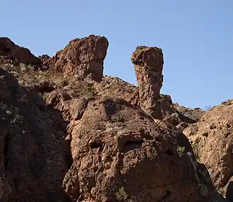 Topock Gorge is a mountainous canyon and gorge section of the Colorado River, located between Interstate 40 and Lake Havasu. The town of Needles, California, to the northwest, was named for the "needle-like" vertical rock outcroppings. The natural landmarks and river crossing by them were one of the journey markers for travelers on historic Route 66.