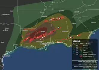 The first signs of organized severe weather came on December 12, when the Storm Prediction Center (SPC) outlined a day 5 risk area across portions of the Mid-South and lower Ohio River Valley.[6] This 15% delineation area was shifted southwestward the following day and translated to a broad Slight risk for severe weather on December 14.[7][8] In their first day 2 outlook, the SPC introduced an Enhanced risk across portions of Louisiana, Mississippi, and Alabama.[9] By the late morning of December 16, a Moderate risk area was introduced from eastern Louisiana through central Mississippi.[10]