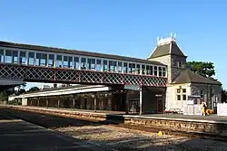 The station has two ranges of buildings, each 244 feet (74 m) long, built in local grey rubble stone on either platform. Deep canopies on composite iron and wood girders cover the platforms; there are further canopies on the road side of both buildings. the building which faces the sea at Abbey Sands and the town is used and this houses the ticket office and a café; the gate from this approach road is open when trains are running.[9] The one remaining signal box (now rented out for commercial purposes) is situated at the south end of this platform near a decorative cast iron bridge across the tracks. The station buildings are Grade II listed.[1]