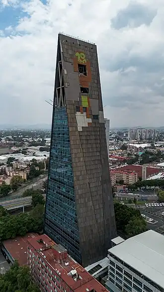 Torre Insignia (also called Torre Banobras and the Nonoalco Tlatelolco Tower) is a building designed by Mario Pani Darqui located on the corner of Avenida Ricardo Flores Magón and Avenida de los Insurgentes Norte, in the Tlatelolco housing complex in Cuauhtémoc in Mexico City.[1][2] At its completion in 1962, the tower became the second tallest building in Mexico after the Torre Latinoamericana. The tower is not currently in use and is being renovated. It is the tallest building in the Tlatelolco area and the third highest in the Avenida Insurgentes. The building housed the headquarters of Banobras. The building has a triangular prism shape and was built with a reinforced concrete frame. It has been remodeled at least twice and houses one of the tallest carillon in the world, with 47 bells made by Petit & Fritsen.