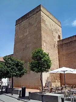 The tower is square-shaped, the sides measuring 7.4 m (24 ft). Built of limestone ashlar blocks, arranged in alternating layers of headers and stretchers, it is accessed through two doors at right angles to each other. The outer door to the north has a pointed Islamic horseshoe arch while the inner door to the east leads into the ground floor which was once converted into a chapel. As a result, the building was also known as Torre de las Imágines (Tower of the Pictures) or Torre de San Benito (Saint Benedict's Tower). There are two upper floors in the tower, each with hemispherical vaulting. From the first floor, the city walls can be accessed through rounded arches to the north and south. The three rounded arches in the eastern wall once housed the chapel bells. There is disagreement as to whether the tower is of 12th-century Almohad origin or was built later during the Christian period.[3][4] It does however appear to have been consolidated as part of the defences following the Christian conquest of Córdoba in 1236.[5]