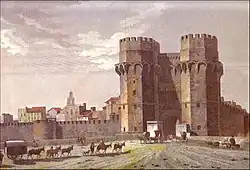 The Serrans Gate or Serranos Gate (Valencian: Porta dels Serrans, Valencian: [ˈpɔɾta ðels seˈrans]; Spanish: Puerta de Serranos, [ˈpweɾta ðe seˈranos]), also known as Serrans Towers or Serranos Towers (Valencian: Torres dels Serrans, Valencian: [ˈtorez ðels seˈrans]; Spanish: Torres de Serranos, [ˈtores ðe seˈranos]) is one of the twelve gates that formed part of the ancient city wall, the Christian Wall (Muralla cristiana), of the city of Valencia, Spain. It was built in Valencian Gothic style at the end of the 14th century (between 1392 and 1398).