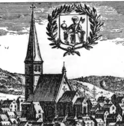 Torshälla Church in a 17th-century engraving by Erik Dahlberg, with the original spire. (Buildings not to scale.)
