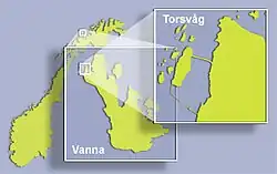 The village of Torsvåg includes a village area on the island of Vannøya and also an area on the islet of Kåja, located just offshore. There is a causeway connecting the two places which forms a nice harbor surrounded by the fishing village. The breakwaters at the entrance to the harbor form a snug port at the threshold of the big seas. The Vanna fish processing plant, «Torsvågbruket», is located on Kåja island and Torsvåg Lighthouse is on the highest point of the island. Today, Torsvåg only has between 10 and 20 inhabitants, but earlier in its history this fishing village often had hundreds of residents.[2]