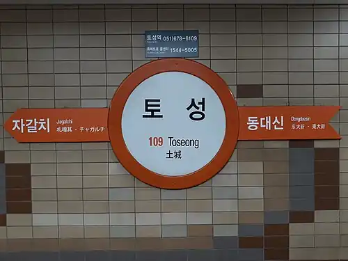 Toseong Station (Korean: 토성역; Hanja: 土城驛) is a station of Busan Metro Line 1 in Toseong-dong, Seo District, Busan, South Korea. The station opened in 1988 as Toseongdong Station (토성동역) but was changed to its current name in 2010.