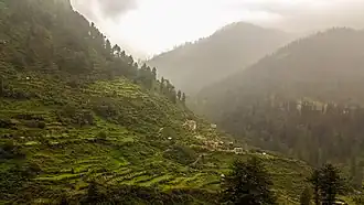 Tosh village is in Himachal Pradesh state of India. It is located at about 2,400 metres (7,900 ft) in elevation on a mountain slope on the right bank of the Parvati River in the Parvati Valley, surrounded by mountains (TOSH is the last village).[1][2] The main occupation of the people in Parvati valley is Tourism. Apple orchards are also a big source of income for the local people. Wooden houses in the village are excellent example of architecture of Mountain people. Tosh is less expensive than its neighbour town Kasol. The guest houses and the hotels are available both at the entrance and far end of the village.[3] Alongside the village is a right-bank tributary of the Parvati River. The Parvati River begins at the Mantalai Glacier within the Parvati Valley. The peaks surrounding the glacier include Papasura, White Sail, Angduri, Pinnacle, and Devachan.[4] Tosh village is reached by bus from Kullu to Barshaini via Kasol and Manikaran and then a one-hour hike.[2][5][6] It is described as a "traditional village turned hippie colony".[6]
